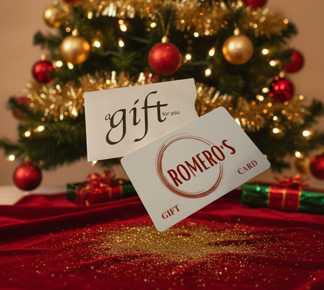 Gift card purchases made in-store are eligible for $20 bonus cards. All bonus cards and promotional rewards are valid for dine-in or carry-out (ordered by phone and picked up by card holder) at Romero’s, excludes events & receptions. Bonus cards redeemable beginning Jan 1, 2026, expiration dates apply. Single use, not valid for change. May not be combined with any other offer, one bonus card per visit. Includes tax, excludes gratuity and the purchase of gift cards.